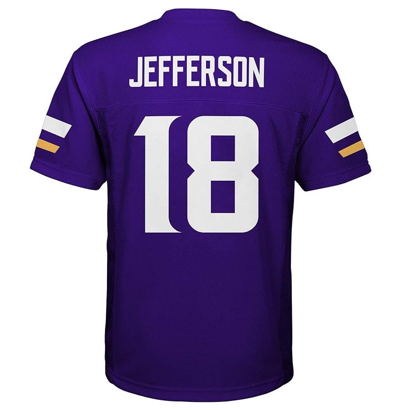 Show your support for Justin Jefferson with this youth replica jersey, designed for boys aged 8-20. Featuring authentic Minnesota Vikings colors and #18, it offers a comfortable fit ideal for game days or everyday wear. Durable materials ensure long-lasting quality, making it a perfect gift for young fans ready to cheer on their favorite player.